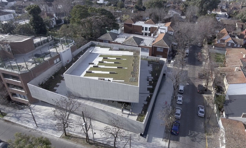 Otra de las preocupaciones del estudio era generar una pieza arquitectónica destacada sin dejar de lado una correcta inserción urbana. Esto se logró a través de dos decisiones: en primer lugar, poner prácticamente la totalidad del programa en el subsuelo, para minimizar el impacto que podría provocar el importante volumen de la sala en el barrio; y por otro lado, proyectar dos retiros sobre la línea municipal: el primero, de tres metros sobre ambas calles, es obligatorio y es donde se apoya el paseo verde, mientras que el segundo llega a la altura máxima permitida con distancias variables hacia la calle, aportando un interesante efecto de escalonamientos volumétricos.