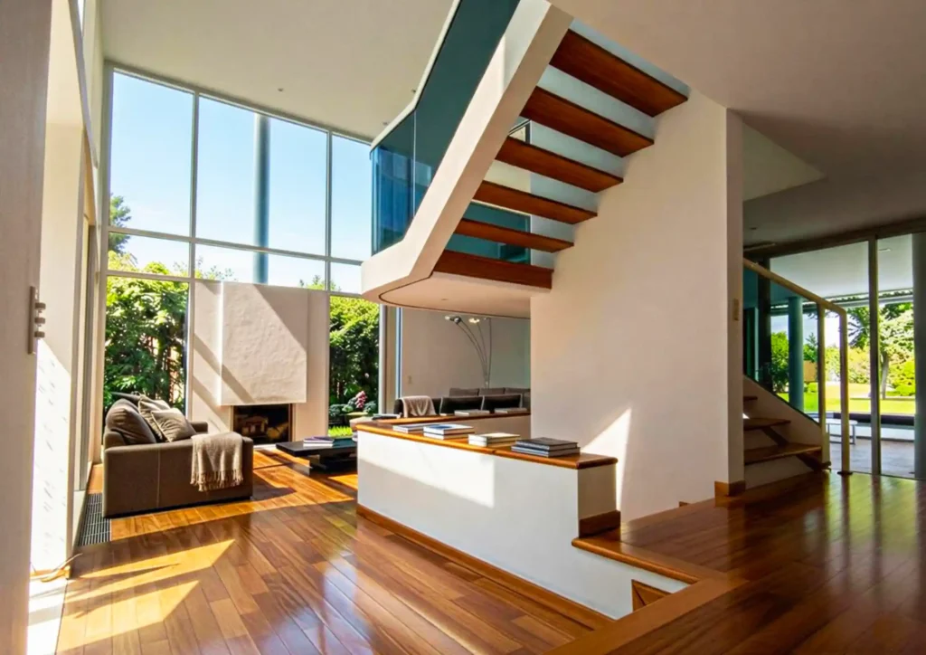 La intervención de Zona Zero fue integral. Uno de los mayores desafíos fue la recuperación de las superficies: se realizó un pulido y restauración de los pisos de madera natural, devolviéndoles la calidez que contrasta con el blanco imperante. Las fachadas recibieron un tratamiento de pintura técnica que recuperó la luminosidad característica del sello Meier.